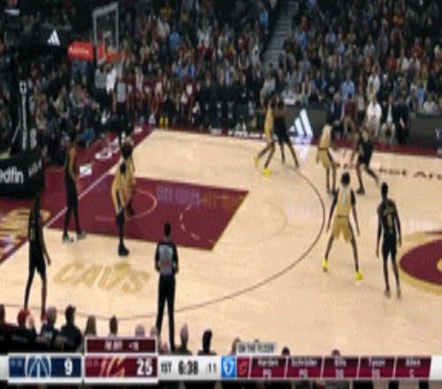 比赛进行到第一节中段,哈登才飙进三分